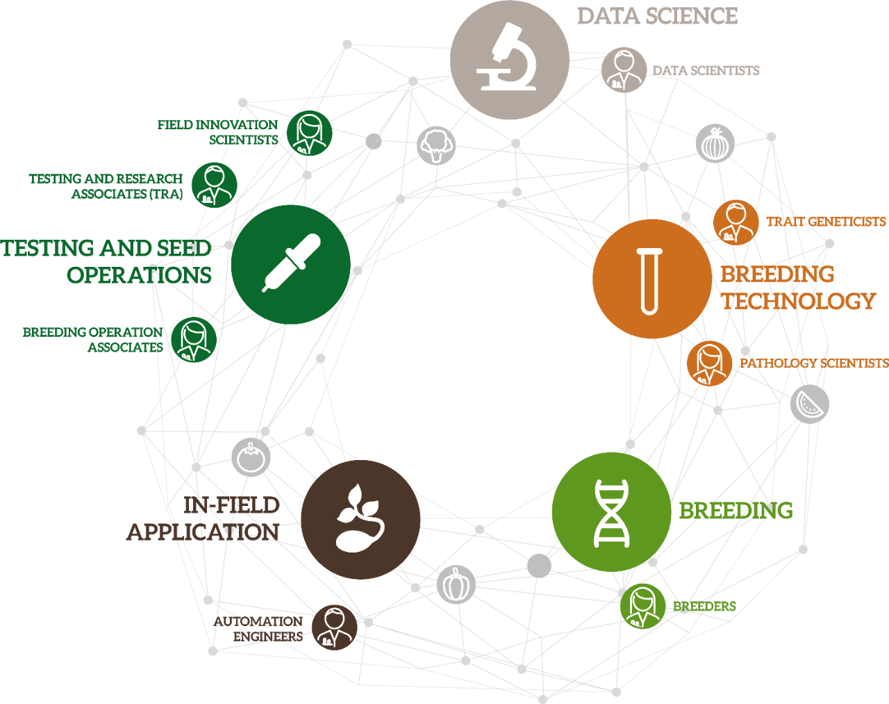 This new community of breeders includes data engineers, discovery breeders, trait geneticists, data scientists, field innovation scientists, testing scientists and research associates and automation engineers. Together, they make a collaborative breeding team that works across our global team to manage germplasm and build a strong pipeline to find global solutions for your local challenges and needs.