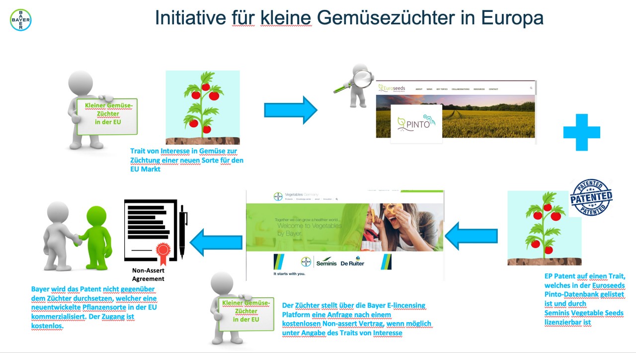Um kleinen Gemüsezüchtern1 in der EU den Zugang zu patentierten Innovationen zu vereinfachen, bietet Bayer die kostenlose Nutzung seiner europäischen Patente2 auf Gemüsesaatgut an, die in der Euroseeds PINTO database gelistet und lizensierbar sind. Die kleinen Unternehmen müssen dafür lediglich eine entsprechende Vereinbarung für die jeweiligen Patente unterzeichnen.